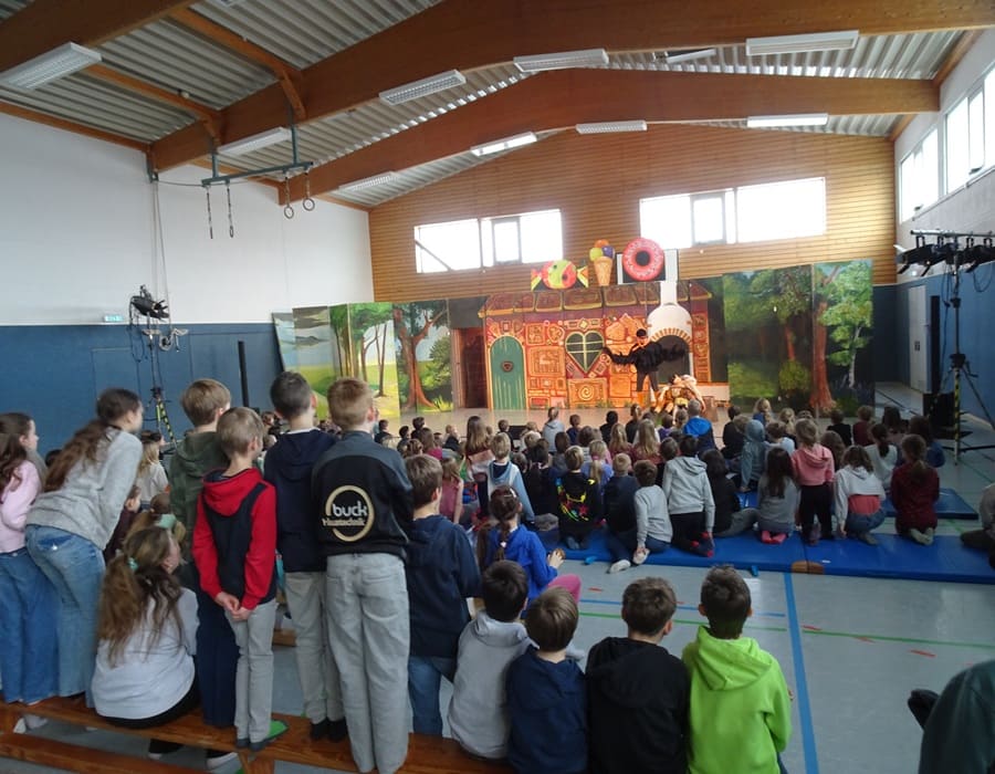 Hänsel und Gretel verliefen sich im Wald.. Wer kennt es nicht, das berühmte Märchen der Gebrüder Grimm... Diese Musikmärchen wurde am Freitag, den 20.2.26 bei uns in der Turnhalle aufgerührt. In 65 Minuten Spielzeit erlebten wir ab 10.15 Uhr eine spannende Geschichte und tolle Lieder. Die 6 Schauspieler des Tourneetheater Hamburgs gaben alles und das Bühnenbild war faszinierend.