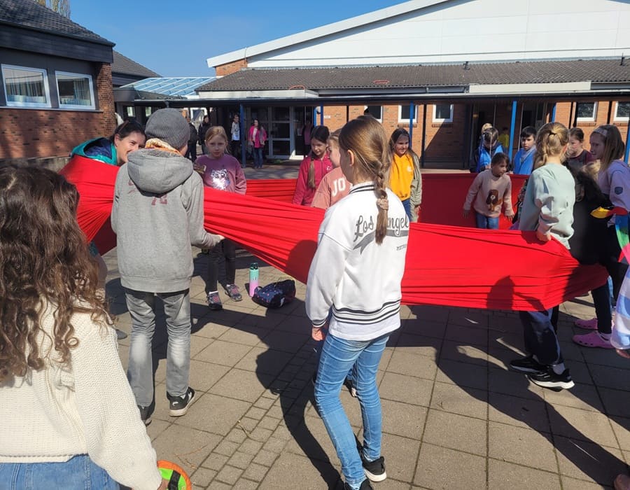 Am Mittwoch, den 15.4.26 fand bei uns das erste Mal eine ganz besondere Pause statt. In der zweiten großen Pause (11.30 bis 11.45 Uhr) besuchte uns der sogenannte Pausenbus. Dies ist ein ganz neues Angebot des Arbeitsbereichs Schulkooperative Arbeit / TEO mit der Ev.-Luth. Kirche. Bei uns waren zwei pädagogische Fachkräfte vor Ort, die allerlei Material im Gepäck hatten und dieses den SchülerInnen erklärt haben. Besonders toll waren die kooperativen Spiele wie die Team-Kugelbahn und der Kooperationsschlauch. Auch Musikinstrumente konnten ausprobiert werden. Das hat Spaß gemacht und war eine tolle Abwechslung!