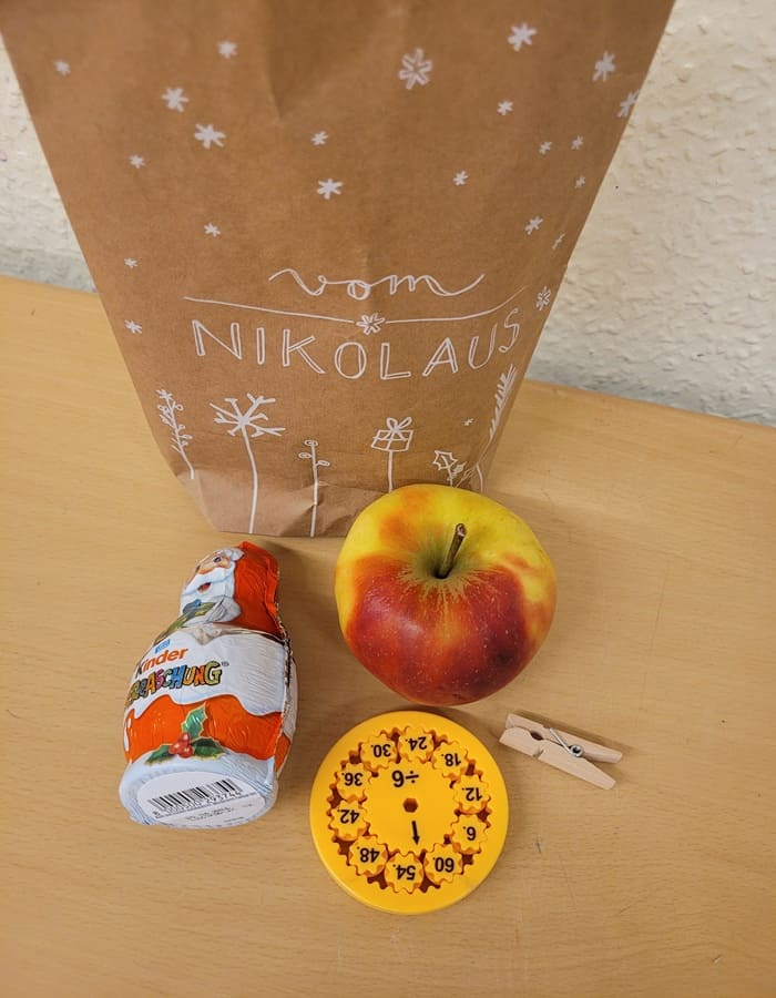 Als die Schüler und Lehrer nach dem Wochenende am Montag wieder in die Schule kamen, staunten sie nicht schlecht: Der Nikolaus war da und hat Geschenke vorbeigebracht. In jedem Klassenraum standen kleine Präsenttüten mit Schokolade, kleinen Spielen, Äpfeln oder Mandarinen. Da müssen wir sehr brav gewesen sein.
