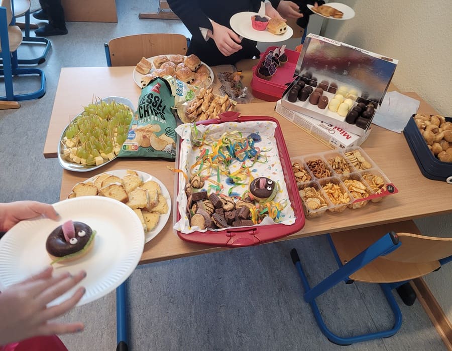Außerdem brachte jeder Schüler einen leckeren Beitrag für das Klassenbuffet mit. Donuts, Kuchen, Schokoküsse, Kekse, Muffins und Co. waren ausnahmnsweise auch einmal erlaubt.