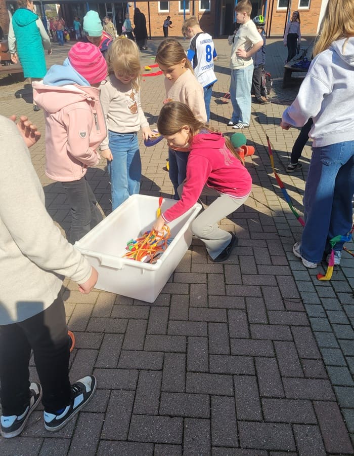 Am Mittwoch, den 15.4.26 fand bei uns das erste Mal eine ganz besondere Pause statt. In der zweiten großen Pause (11.30 bis 11.45 Uhr) besuchte uns der sogenannte Pausenbus. Dies ist ein ganz neues Angebot des Arbeitsbereichs Schulkooperative Arbeit / TEO mit der Ev.-Luth. Kirche. Bei uns waren zwei pädagogische Fachkräfte vor Ort, die allerlei Material im Gepäck hatten und dieses den SchülerInnen erklärt haben. Besonders toll waren die kooperativen Spiele wie die Team-Kugelbahn und der Kooperationsschlauch. Auch Musikinstrumente konnten ausprobiert werden. Das hat Spaß gemacht und war eine tolle Abwechslung!